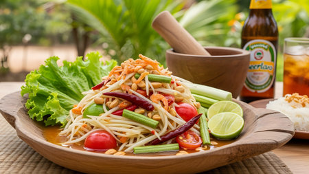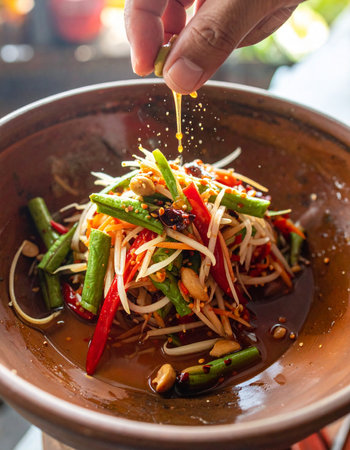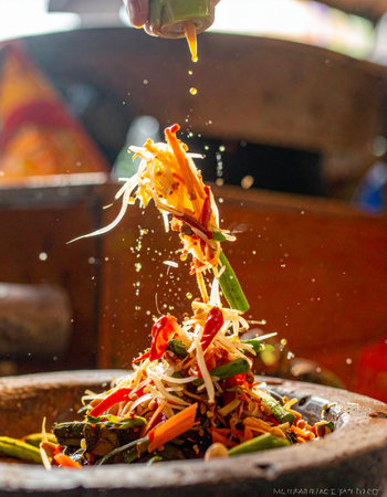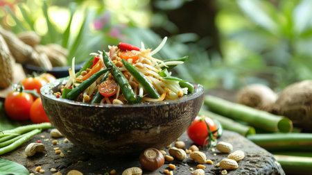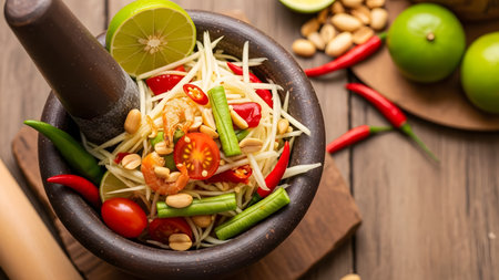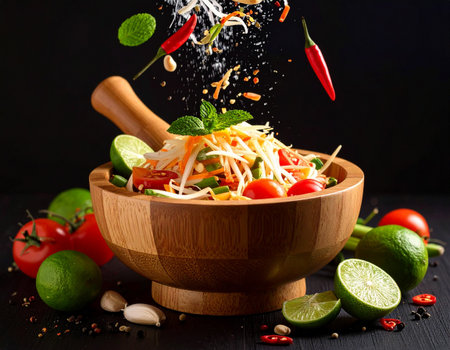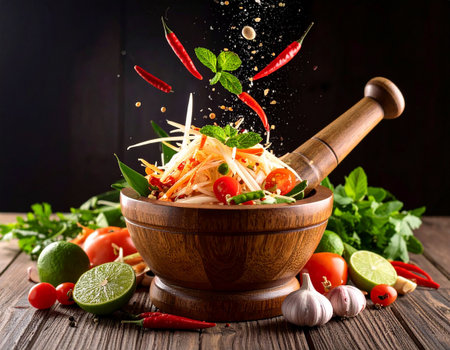 AI generated fresh thai som tum papaya salad ingredients falling into wooden mortar vibrant spicy sour sweet flavors authentic street food healthy crunchy texture