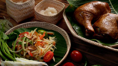 Cropped shot of Somtum or papaya salad, Thai traditional food with chicken grilled and sticky rice on wooden desk