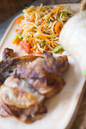 Famous Thai food papaya salad and grilled chicken on wooden plate selective focus