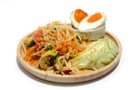 Thai Style Papaya Salad with Satled Eggs on wood dish in local Thailand