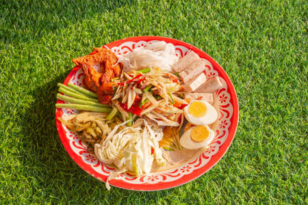Papaya salad (som tum) tray spicy on green grass, Thai local food top view, close up.