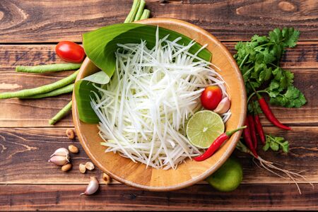 Papaya salad (Som Tam) ingredients on wooden table background.The famous local Thai street food dish with the taste of hot and spicy.
