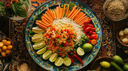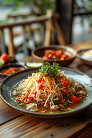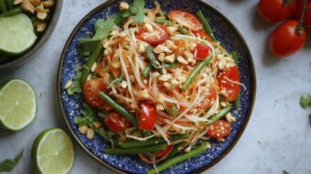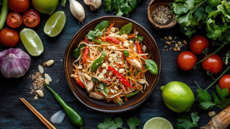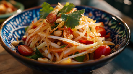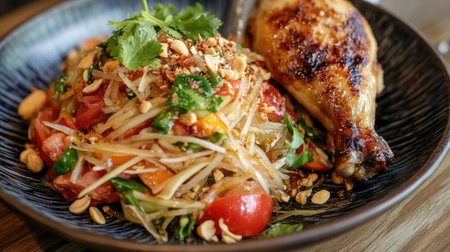 A vibrant plate of Som Tum with colorful ingredients like shredded green papaya, tomatoes, peanuts, and chili, garnished with fresh herbs, showcasing the essence of Thai cuisine.