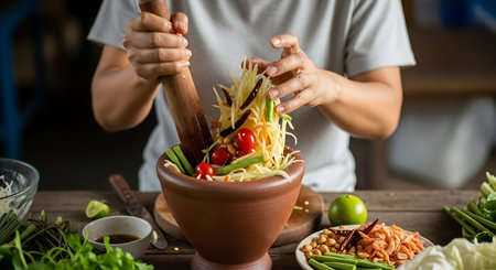 Close-up of som tam salad being pounded in a mortar and pestle, releasing aromatic flavors and textures for a truly authentic Thai dining experience