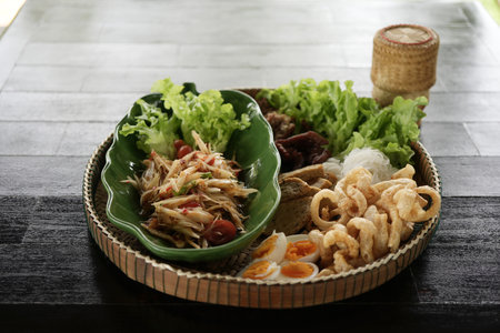 Som tum Papaya salad with pork crackling, eggs, vegetable, and sticky rice
