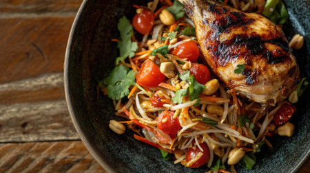 A mouthwatering dish featuring juicy chicken served with a vibrant salad, fresh vegetables, and a crunchy garnish for a delightful culinary experience.