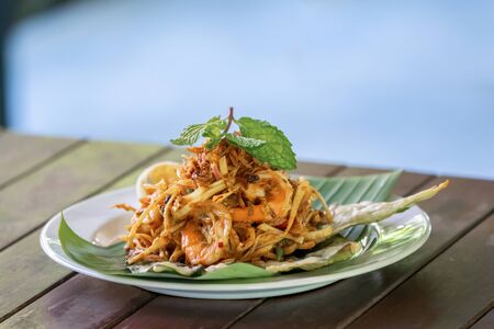 Yum Hua Plee is the spicy banana blossom salad from Thailand local traditional North area is shot on the wood table.