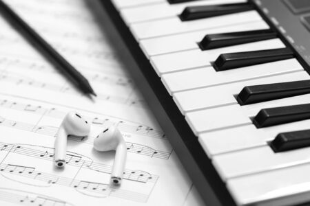 Headphones on musical synthesizer keyboard. Headphones on electronic piano. Musical background