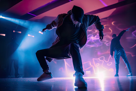 Young dynamic dancers on stage dancing breakdance in bright blue and orange spotlights, AI generative illustration