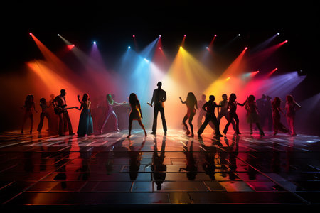 A captivating silhouette of dancers on stage, showcasing their dynamic movements and unity under dramatic lighting effects, expressing energy and artistry.