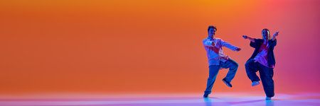 Dynamic image of talented young man and woman, dancers performing hip-hop against gradient studio background in neon light