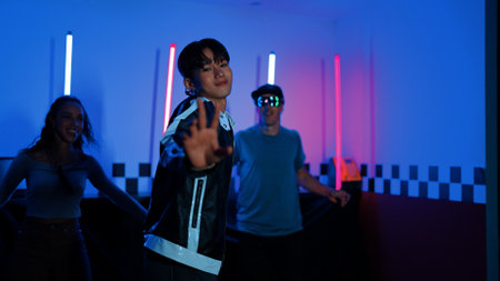 Diverse street dancer moving to city pop music at party with neon light while man wearing fancy glasses. Attractive hipster perform or practicing dancing together while looking at camera. Regalement.