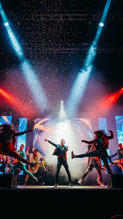 A dynamic stage performance with a singer in the center, surrounded by dancers, illuminated by red and blue spotlights with confetti falling.
