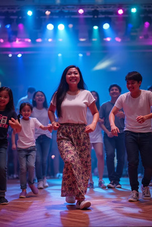 A group of dancers leaps and moves energetically against a backdrop of dazzling neon lights. The pulsating colors create a captivating atmosphere, highlighting their choreography.