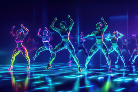 Women perform synchronized dance moves in neon lights during an energetic fitness class at night.