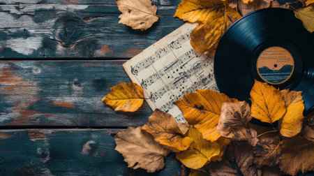 A nostalgic composition featuring a vintage vinyl record surrounded by autumn leaves and a music sheet on a rustic wooden background. Perfect for themes of music and nature.