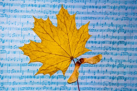 Notes from a song. Leaves and music notes. Amazing autumnal backdrop right here. the creative process the music of autumn. a sheet of paper with music notes a pile of dead leaves in a park or garde