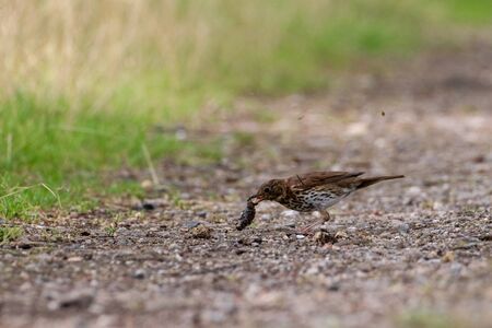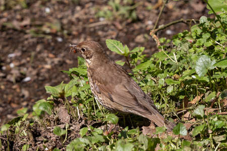 Song thrush bird with insect in his beak ( Turdus Philomelos )