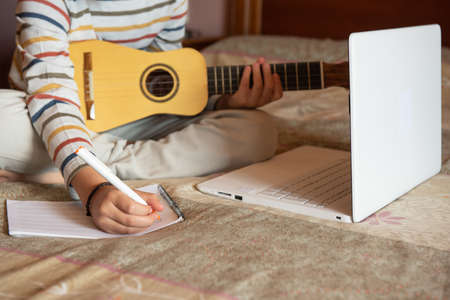 The boy try to learning the timple lesson at home from the internet with his laptop. He writes a new song with chords in his notebook. The timple is a typical musical instrument from the Canary Islands, Spain