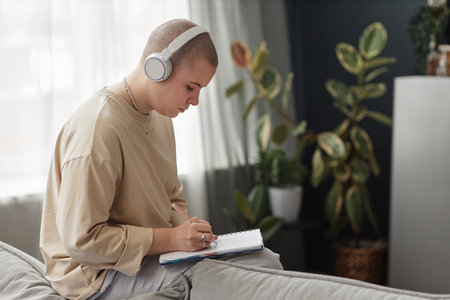 Side view of young Caucasian female student wearing headphones sitting in living room at home making notes in notebook
