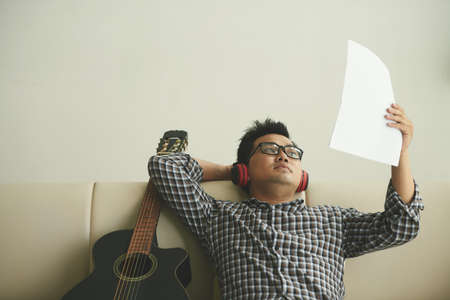 Pensive talented composer looking at paper with notes