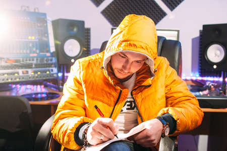 DJ writes new lyrics in recording studio. Young man in yellow coat wtites lyrics in recording studio. DJ create new music track.