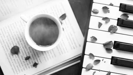 Cup of coffee with book and piano keyboard, black and white