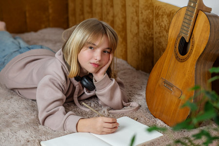 Child girl is lying on cozy couch, appearing thoughtful as she writes in her notebook. Guitar is positioned next to her, highlighting her passion for music in serene environment.