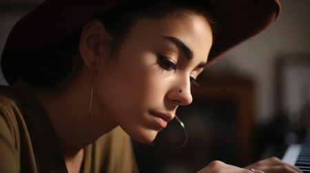Songwriter Female Hispanic Young Adult Writing lyrics and composing music for artists or for their own songs in Home studio. Generative AI AIG22.