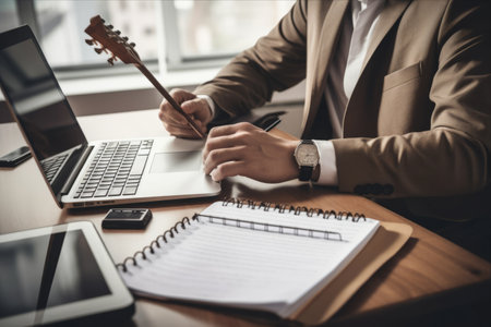 Musician playing guitar and writing notes on memo pad concept art of playing music