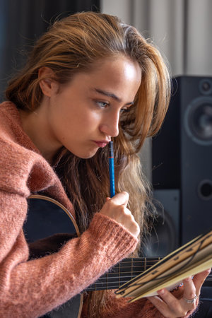 Teenage girl learning to play guitar at home. Girl composing music. Guitar.