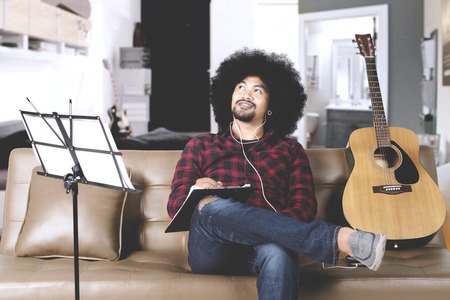 Young afro man composing a song while listening music on earphone at home