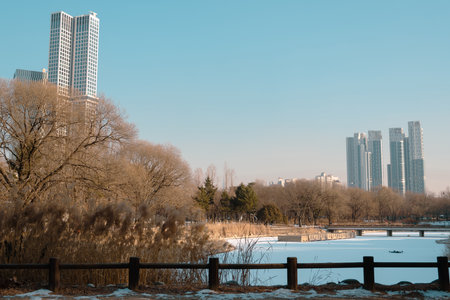Seoul Forest Park and apartment building at winter in Seoul, Korea