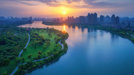 Aerial view of the river and meadows at sunset