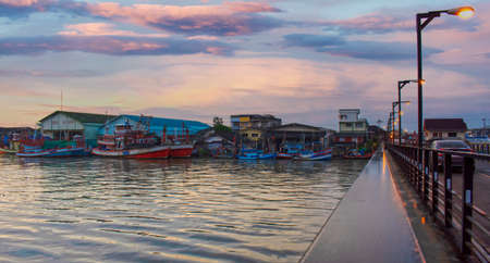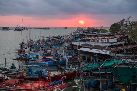 traditional fishing and torist boats and village at fisherman dock during sunrise of Cha-am, Phetchaburi Province, Thailand. Seafood industry.