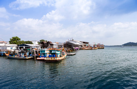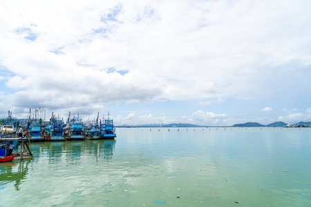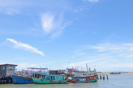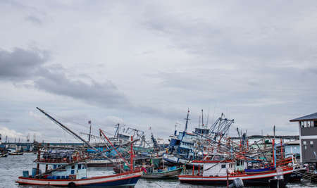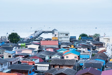 Local fisherman village and boats by the sea in summer, Sriracha, Chonburi, Thailand.