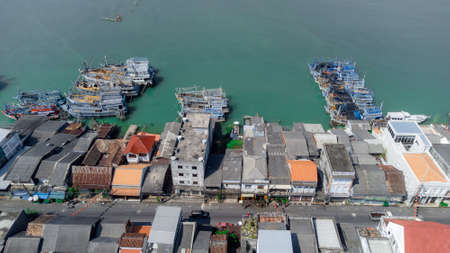 Aerial view of fisherman dock which has many ships anchoring for transport seafood and supplies on island of Songkhla, Thailand