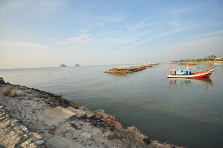 pier on the seashore There is a fishing boat in the morning. beautiful atmosphere