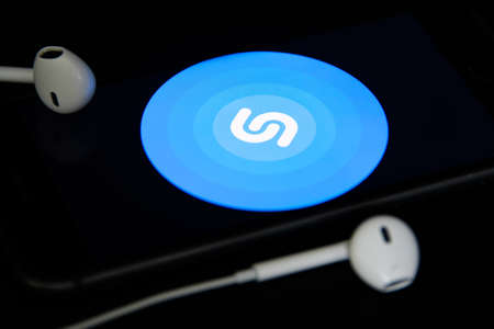 Rheinbach, Germany 4 May 2021, Close-up of the Shazam logo on the screen of a smartphone with headphones