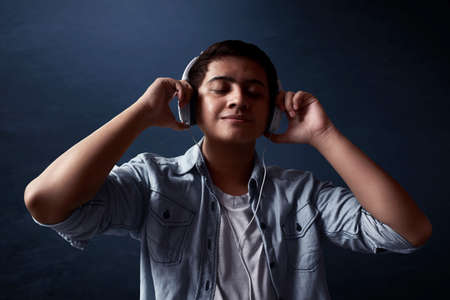Happy young Asian boy teenager listening to music with his headphones over a grey background.