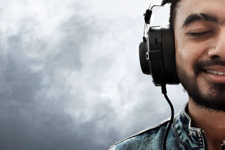 Closeup of an Afroamerican man with headphones, minimalist style, monochrome white and black background, modern and fresh