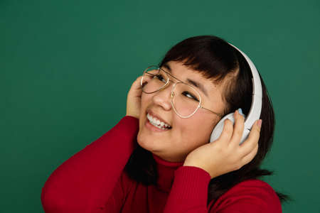 Listening to music. East asian young beautiful womans portrait on green studio background with copyspace. Brunette female model. Concept of human emotions, facial expression, sales, ad, fashion.