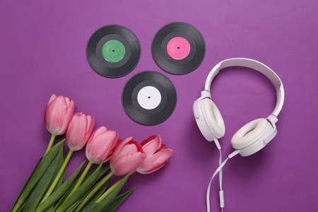 Pink tulips with headphones and vinyl record on purple background. Romantic, music, love concept. flat lay
