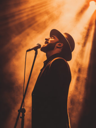 Artist with hat singing on stage under warm orange backlight, representing emotion, music, and creative self-expression.