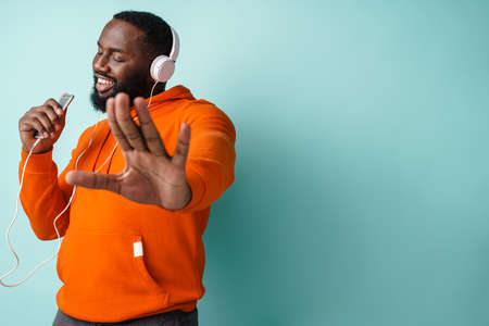Cheerful african american man singing while using cellphone and headphones isolated over blue background