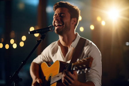 A man playing a guitar and singing into a microphone. This image captures the energy and passion of a live musical performance. Perfect for promoting concerts, music festivals, or showcasing the talent of a musician.