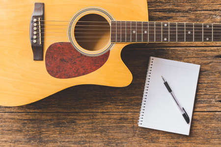 Top view of Acoustic guitar , Notebook paper and pen on wood background and copy space
