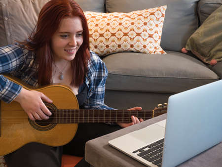 Young woman is learning to play the guitar online. Remote music lessons on a laptop