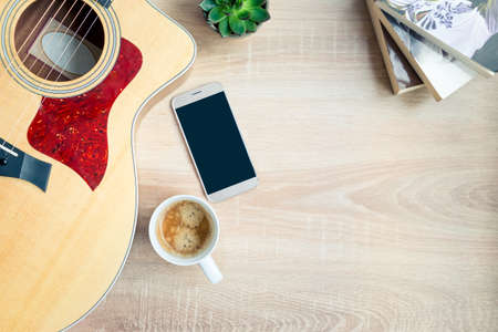 Top view of cosy home scene. Guitar, books, cup of coffee, phone and succulent plants over wooden background. Copy space, mock-up.