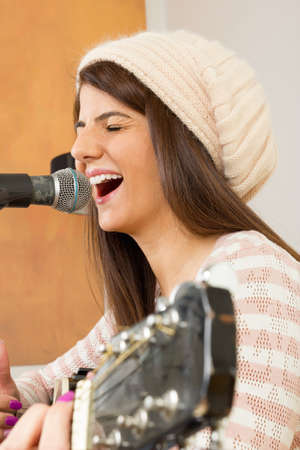 Repetition of retro music band at music studio. Young musician playing acoustic guitar and singing. Rehearsal base. Concept of art, music, style and creation